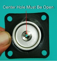 This is the step that causes the most problems. Carefully assemble the plunger. The spring goes in the top of the plunger and is inserted spring side up. The rubber end of the plunger must be down to contact the steel plate on the diaphragm. This causes a seal when the unit is off and cuts fuel flow through the small hole.